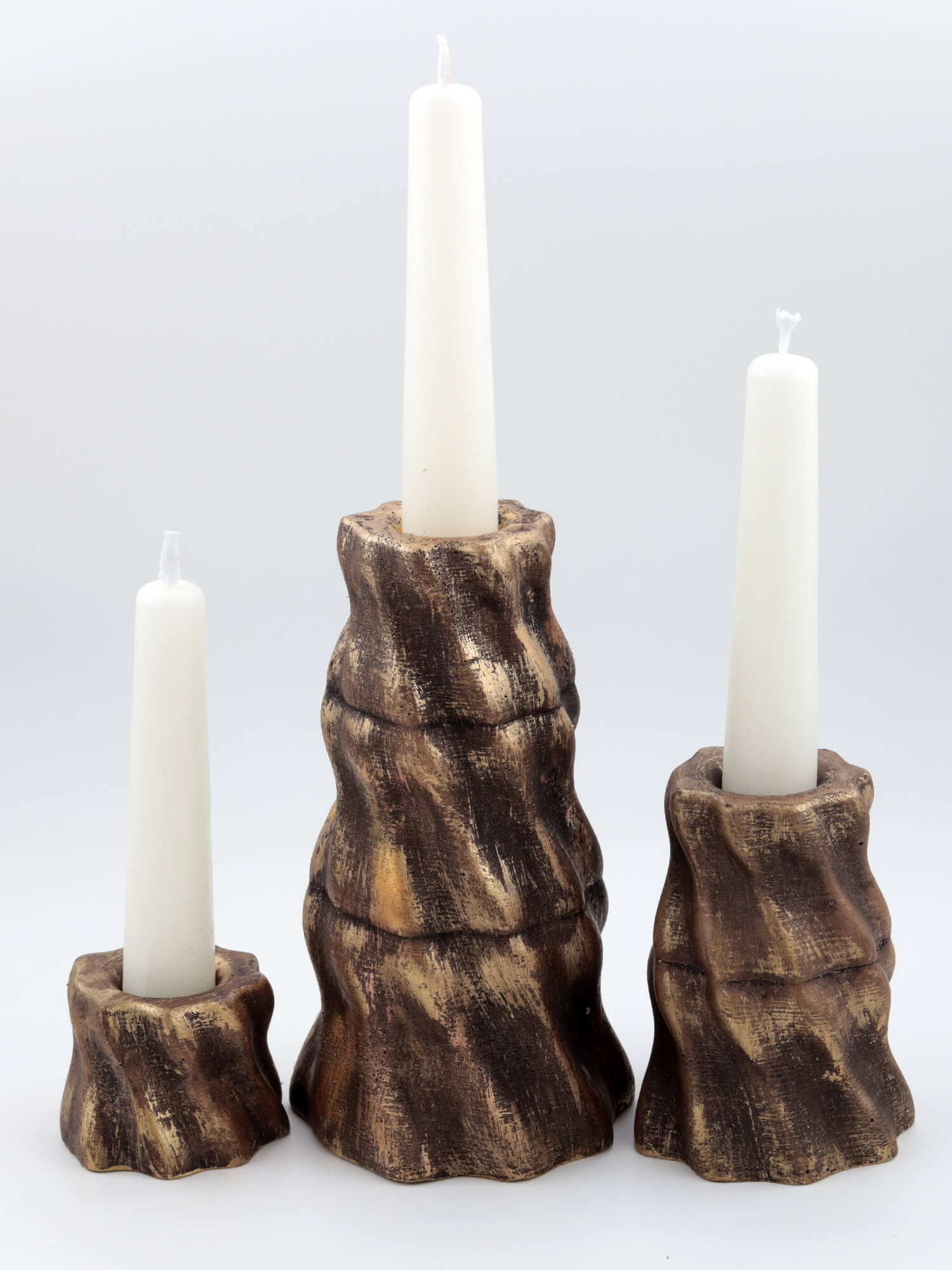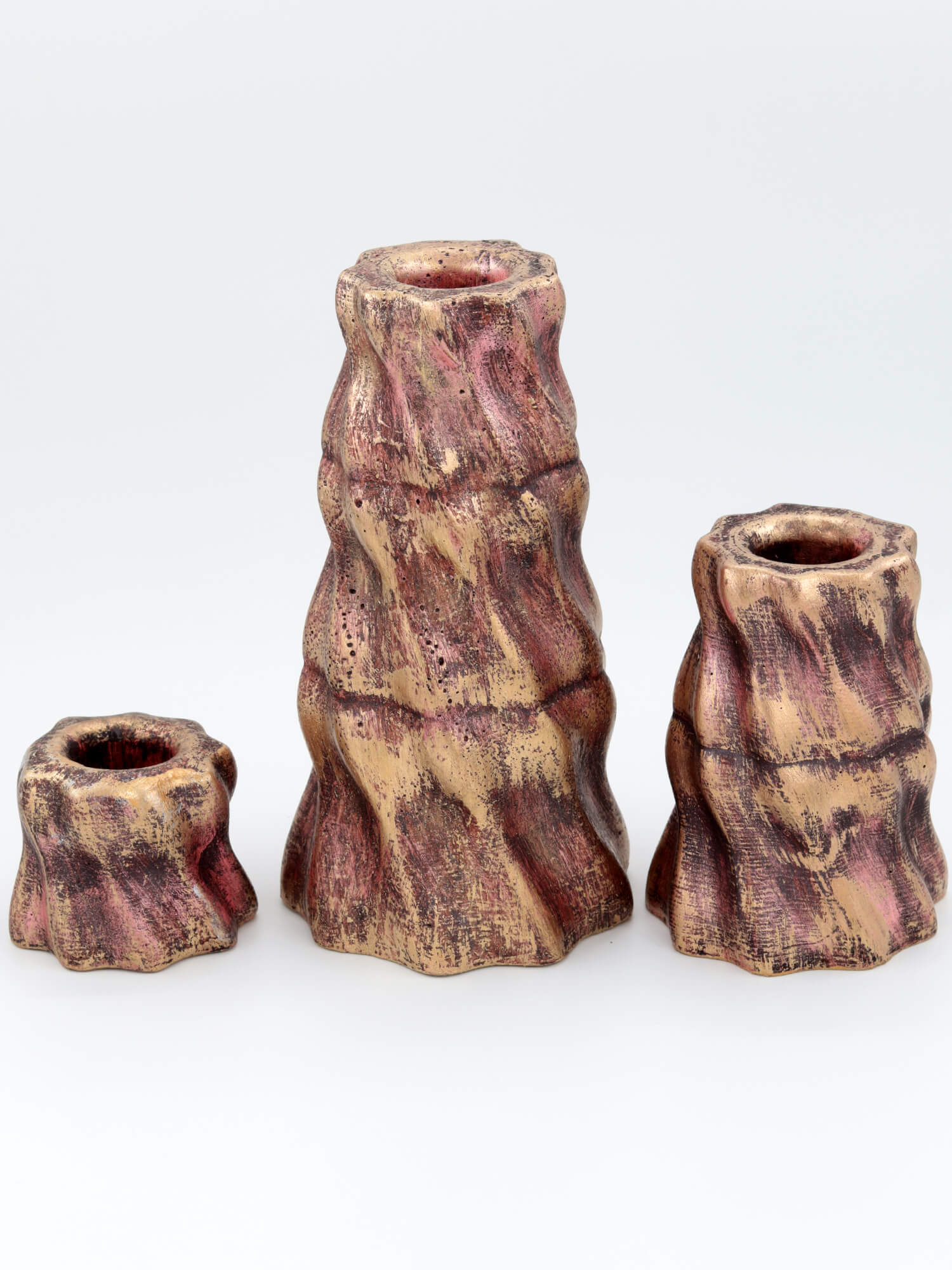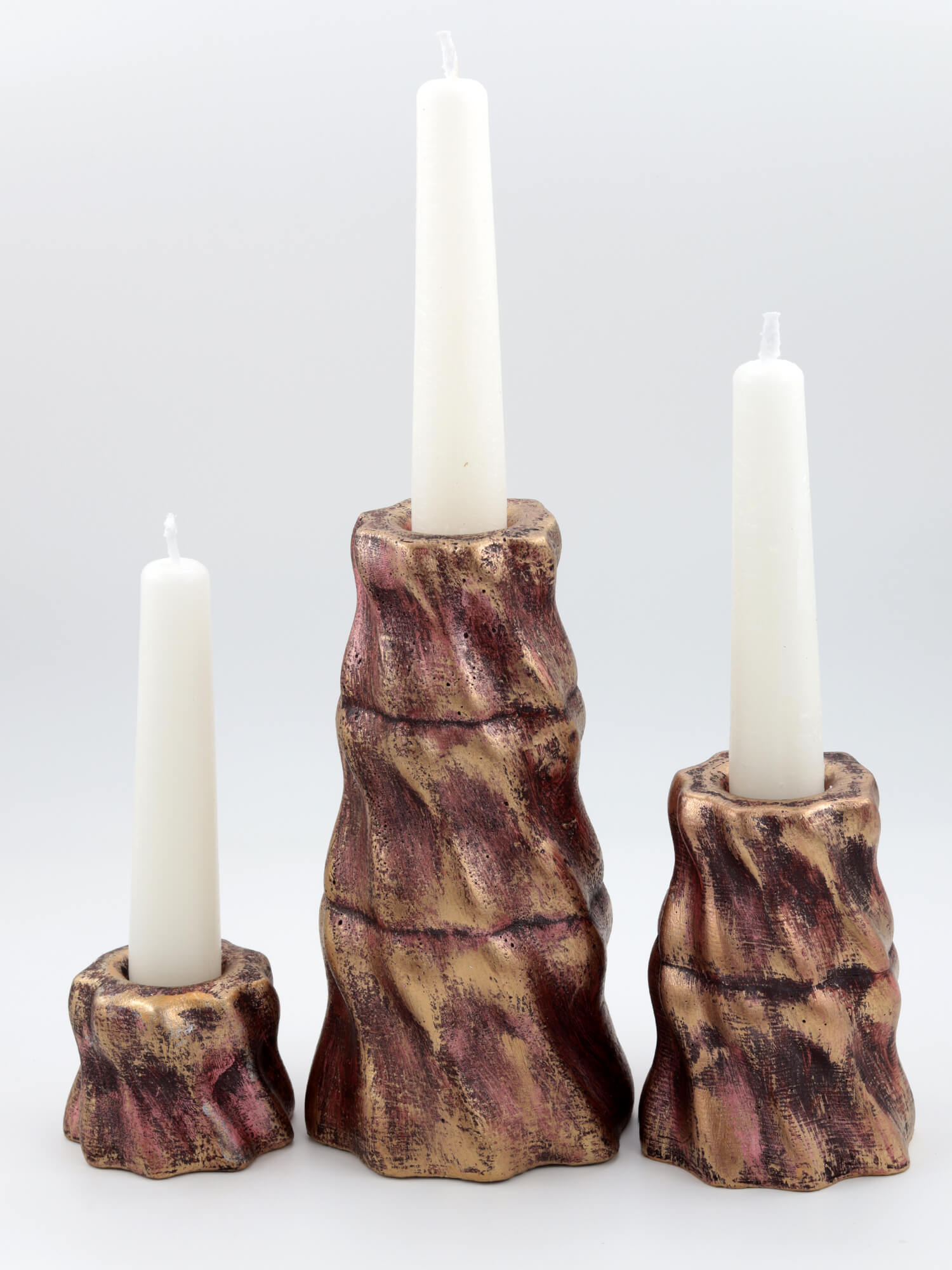 Bu üçlü mumluk seti; bronz, bakır ve altın tonlarında, eskitme dokunuşlarla tasarlanmış dekoratif bir objedir. Küçük, orta ve büyük olmak üzere üç farklı boydan oluşur ve her biri akışkan, dalgalı formuyla mekâna güçlü bir karakter kazandırır.