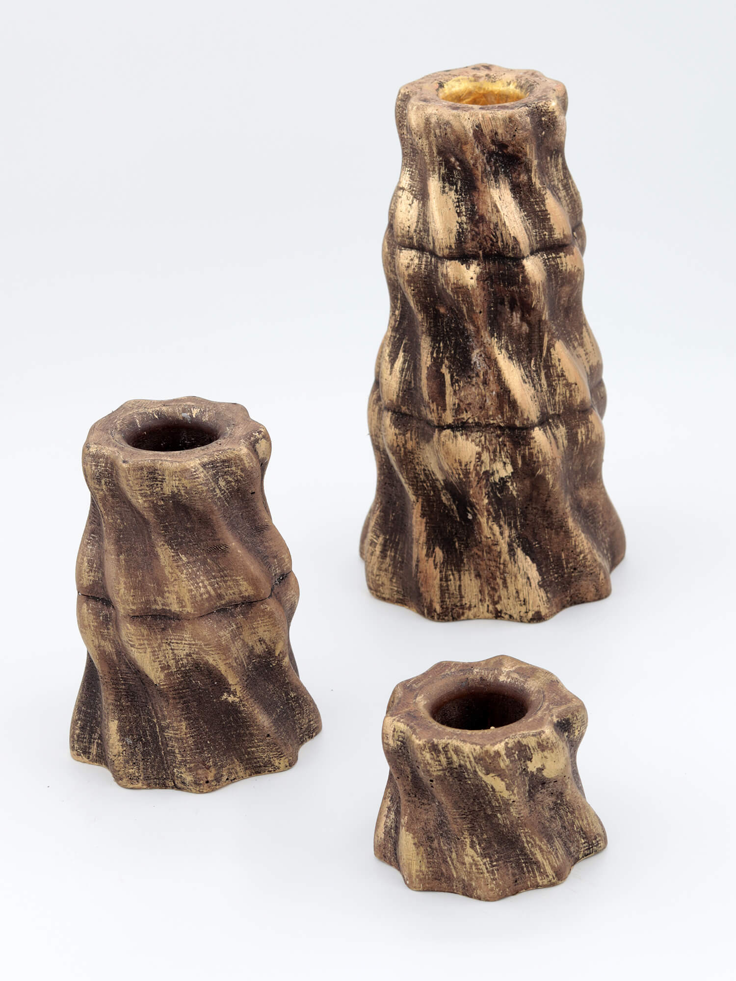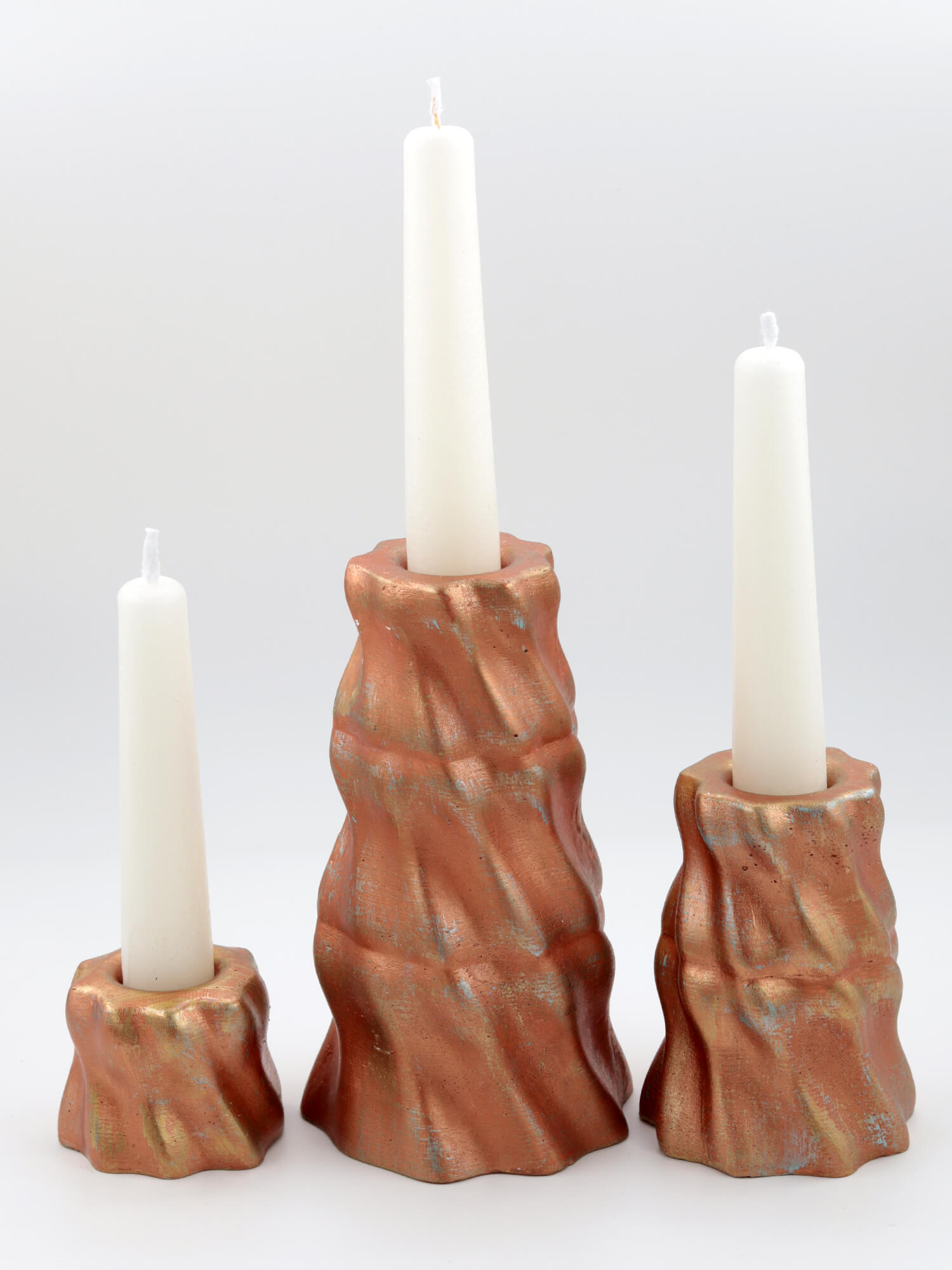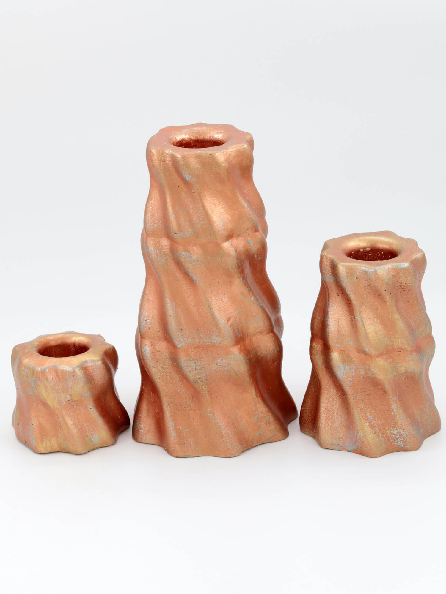 Bu üçlü mumluk seti; bronz, bakır ve altın tonlarında, eskitme dokunuşlarla tasarlanmış dekoratif bir objedir. Küçük, orta ve büyük olmak üzere üç farklı boydan oluşur ve her biri akışkan, dalgalı formuyla mekâna güçlü bir karakter kazandırır.