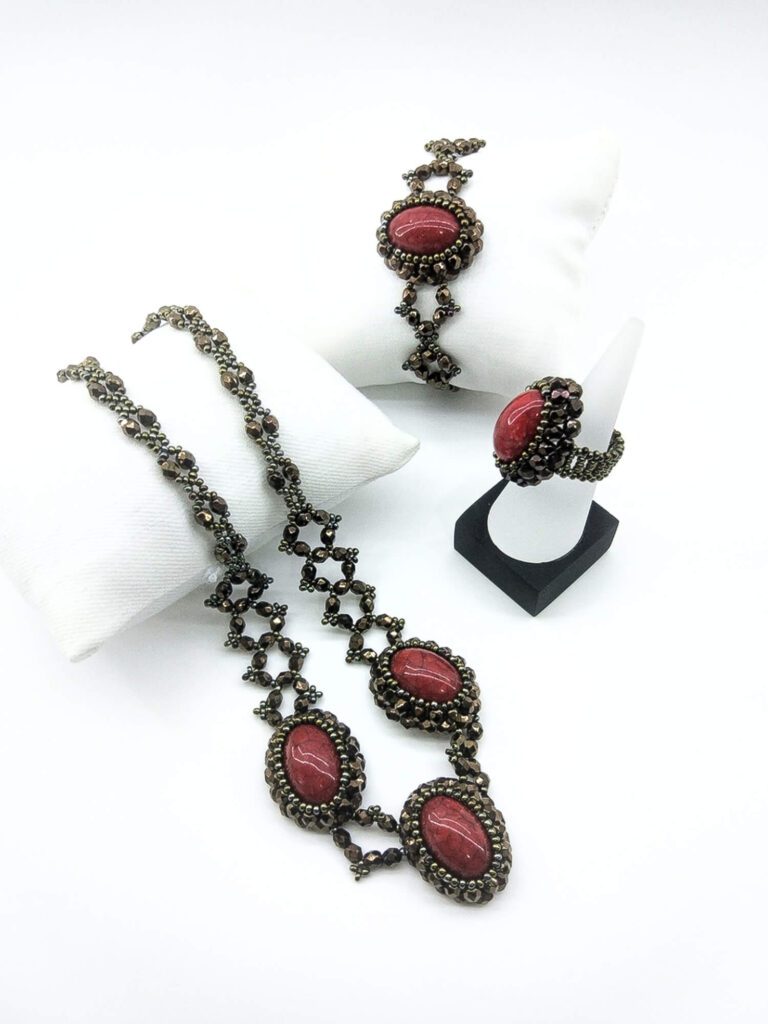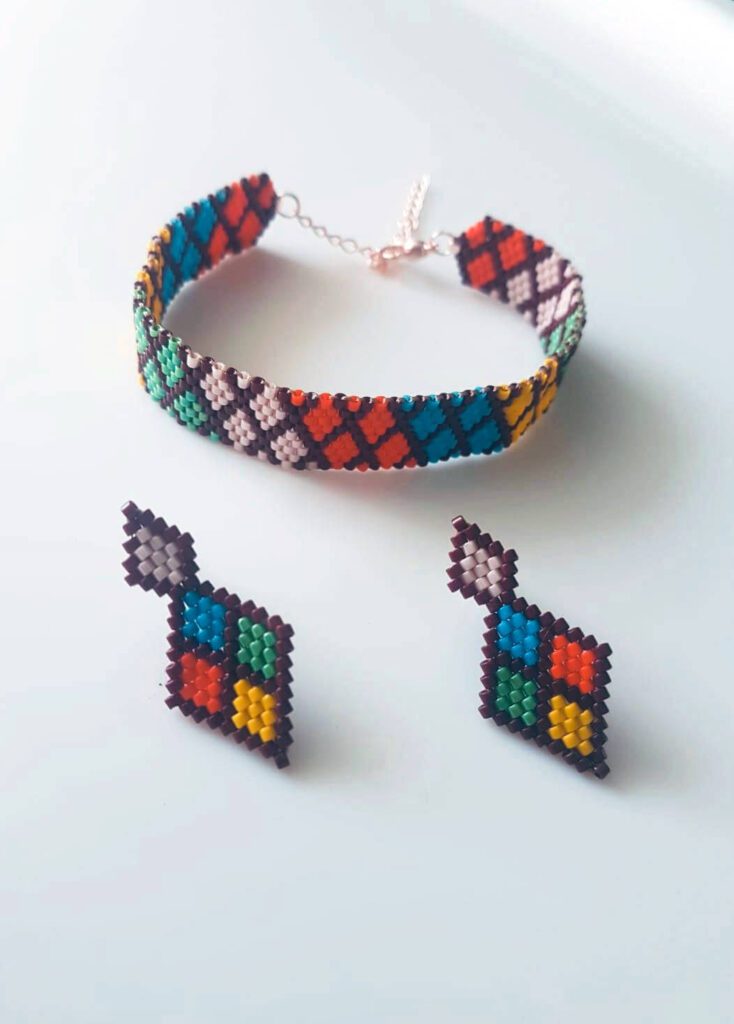 Renkli Hapishane işi kolye ve bileklik modeli. Kum boncuklarla elde işlenmiştir. Kolye uzunluğu 40-45 cm bileklik uzunluğu 18 cm dir.