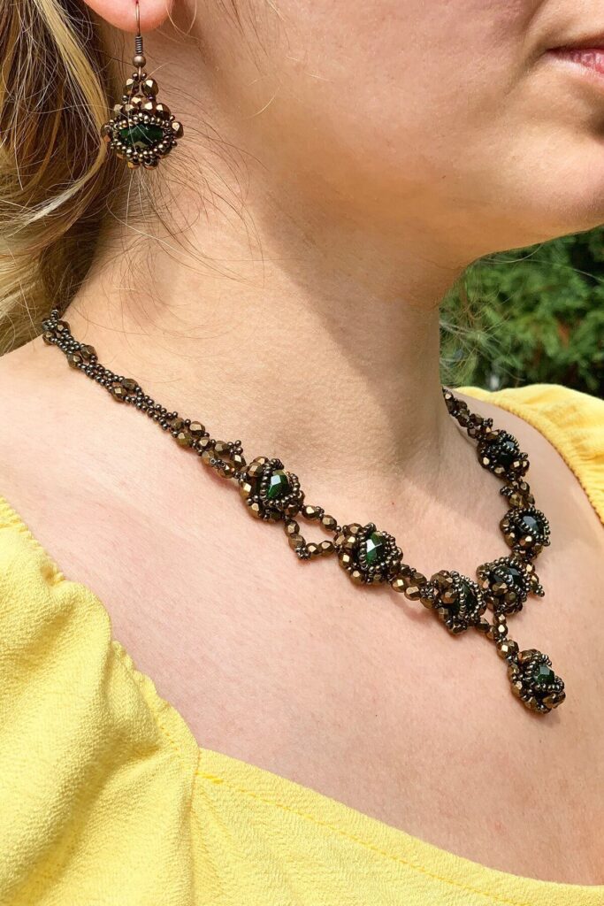 Sevdikleriniz ve kendiniz için şık bir tasarım.Orjinal miyuki işlemeli kolye ve küpe modeli tamamen elemeği ile yapılmıştır.